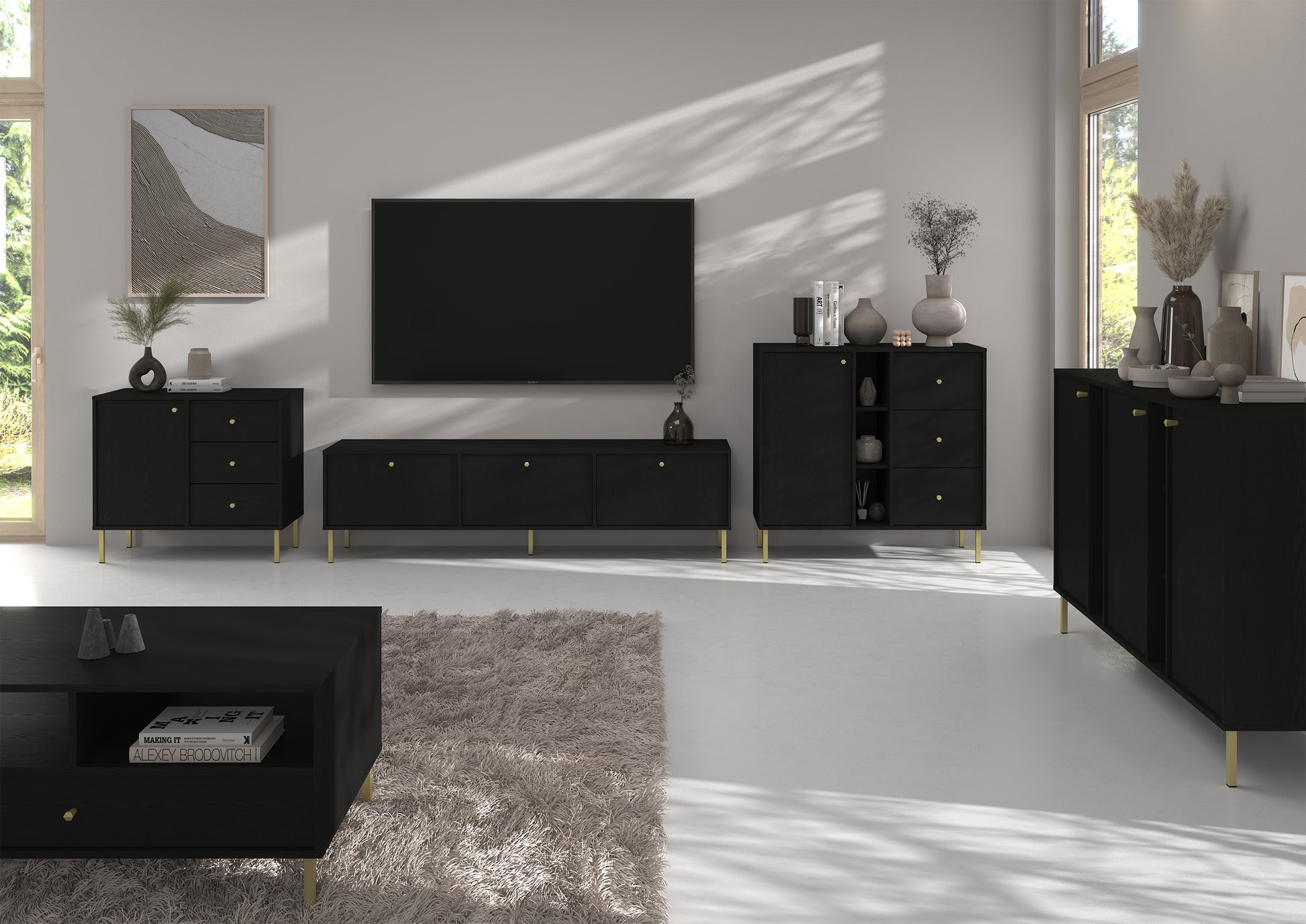 Komoda trzydrzwiowa Oktio z półkami 159 cm czarny grafit na złotych nogach