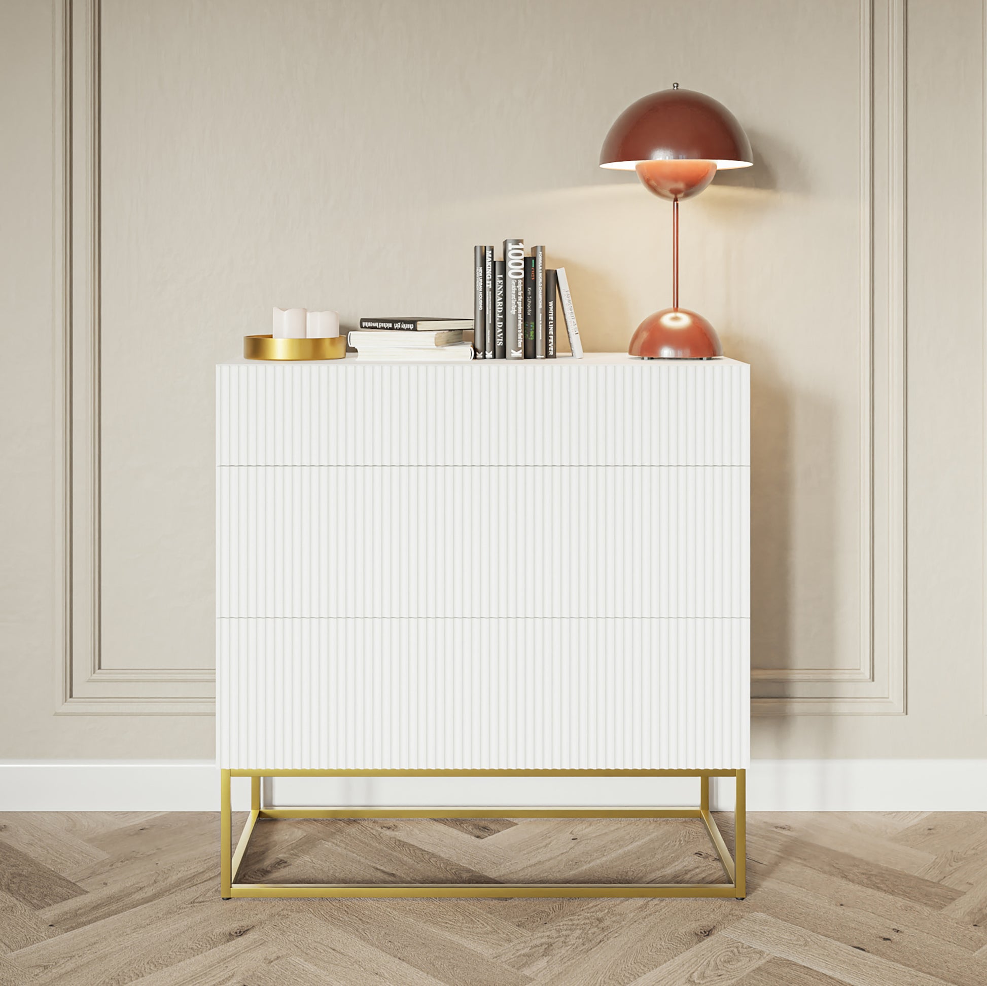 Komoda Veldio z frezowanym frontem i trzema szufladami 90 cm Biała ze złotymi nogami