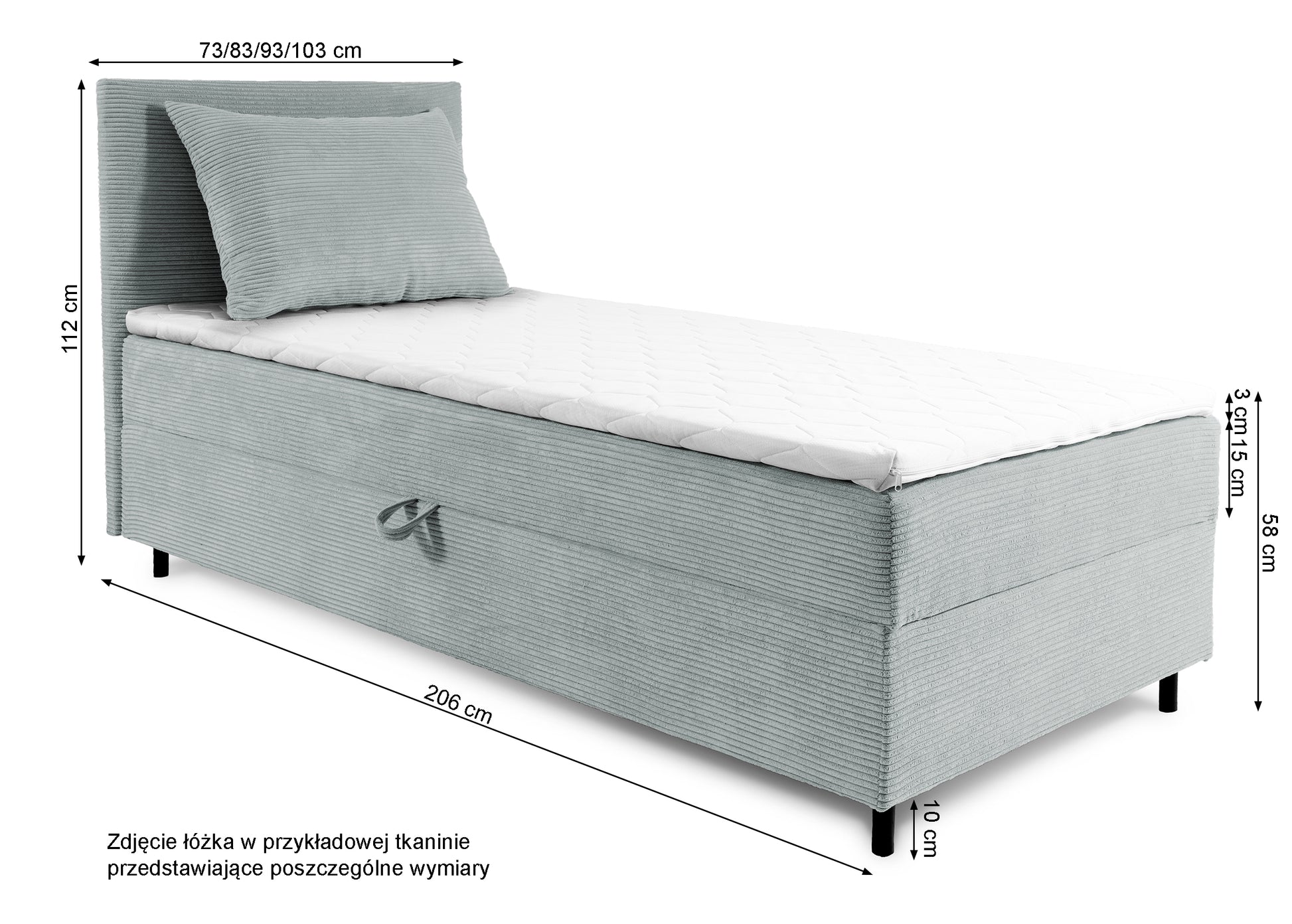 Jednoosobowe łóżko kontynentalne Montigo wyśmienicie odnajdzie się we współczesnej sypialni. Model ten olśniewa solidną prostą bryłą, którą wzbogaca wysokie, tapicerowane zagłowie. Niewątpliwym atutem łóżka jest pojemnik na pościel umiejscowiony pod materacem, łatwo otwieralny, dzięki automatowi na sprężynach. W zestawie z łóżkiem znajduje się materac, który składa się ze sprężyn bonellowych oraz topper wykonani z pianki T25. Efektem takiego połączenia jest niezwykła wygoda spania na łóżku. Całości dopełnia miła w dotyku sztruksowa tkanina sprawiając, że nie będziesz chciał z niego wstać.