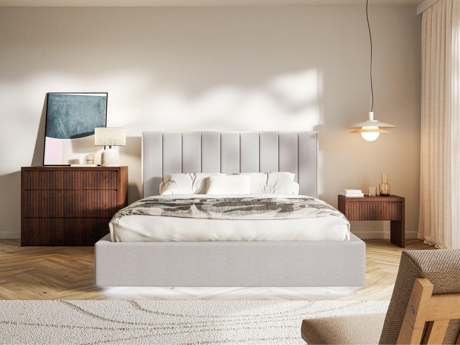 Łóżko tapicerowane Togents to coś więcej niż mebel – to centralny punkt Twojej sypialni, który zachwyca zarówno wyglądem, jak i praktycznymi rozwiązaniami. Miękki zagłówek z pionowymi przeszyciami dopełnia elegancka płyta meblowa w kolorze kaszmiru – połączenie tkaniny i dekoracyjnej płyty nadaje całości wyjątkowej głębi oraz nowoczesnego charakteru. Taka kompozycja tworzy efektowne, przestrzenne tło, które nie tylko zdobi, ale też zapewnia wygodne podparcie dla pleców. Dzięki zastosowaniu hydrofobowej tkaniny, łóżko jest odporne na płyny i łatwe w czyszczeniu – doskonały wybór dla osób ceniących estetykę i funkcjonalność na co dzień. Zintegrowane, ręcznie sterowane oświetlenie LED subtelnie podkreśla formę mebla i tworzy przytulny klimat w sypialni – idealny do wyciszenia się po długim dniu. Pojemny schowek na pościel ukryty w ramie łóżka pozwala na wygodne i estetyczne uporządkowanie tekstyliów, zyskując więcej miejsca w szafach. Postaw na łóżko Togents – design, który zachwyca i komfort, który czuć każdej nocy!