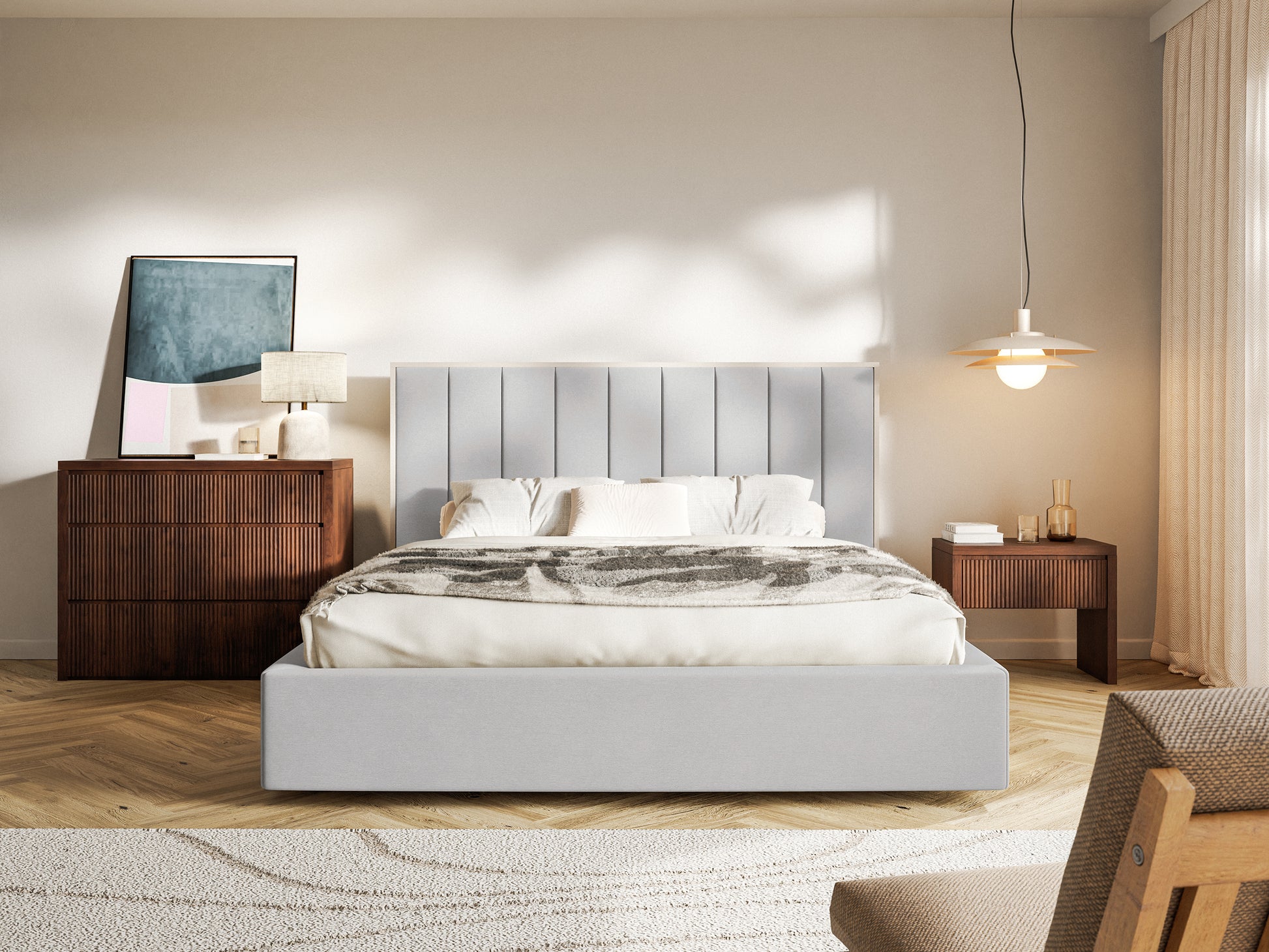 Łóżko tapicerowane Togents to coś więcej niż mebel – to centralny punkt Twojej sypialni, który zachwyca zarówno wyglądem, jak i praktycznymi rozwiązaniami. Miękki zagłówek z pionowymi przeszyciami dopełnia elegancka płyta meblowa w kolorze kaszmiru – połączenie tkaniny i dekoracyjnej płyty nadaje całości wyjątkowej głębi oraz nowoczesnego charakteru. Taka kompozycja tworzy efektowne, przestrzenne tło, które nie tylko zdobi, ale też zapewnia wygodne podparcie dla pleców. Dzięki zastosowaniu hydrofobowej tkaniny, łóżko jest odporne na płyny i łatwe w czyszczeniu – doskonały wybór dla osób ceniących estetykę i funkcjonalność na co dzień. Pojemny schowek na pościel ukryty w ramie łóżka pozwala na wygodne i estetyczne uporządkowanie tekstyliów, zyskując więcej miejsca w szafach. Postaw na łóżko Togents – design, który zachwyca i komfort, który czuć każdej nocy!