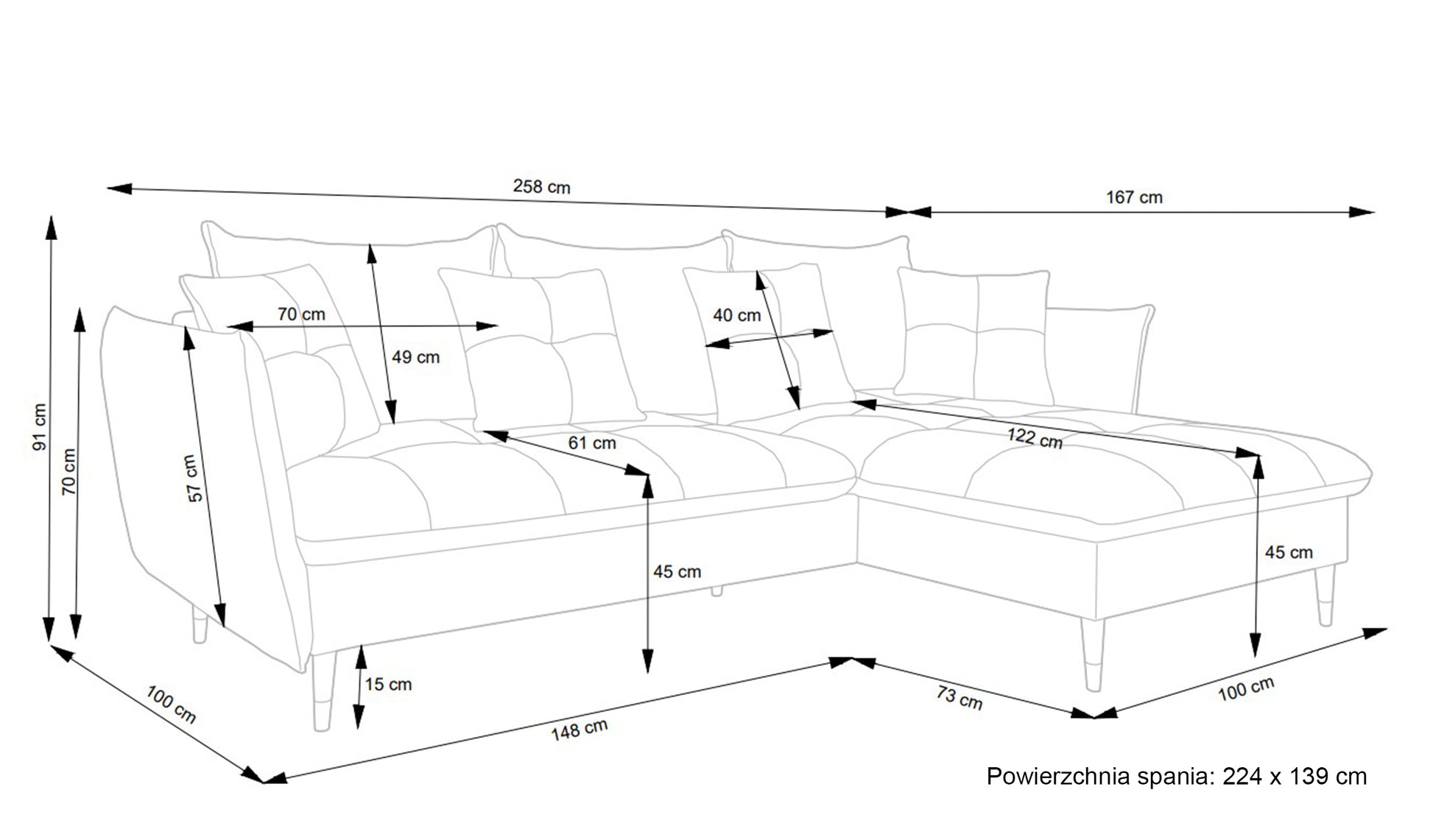 - szerokość oparcia: 258 cm,