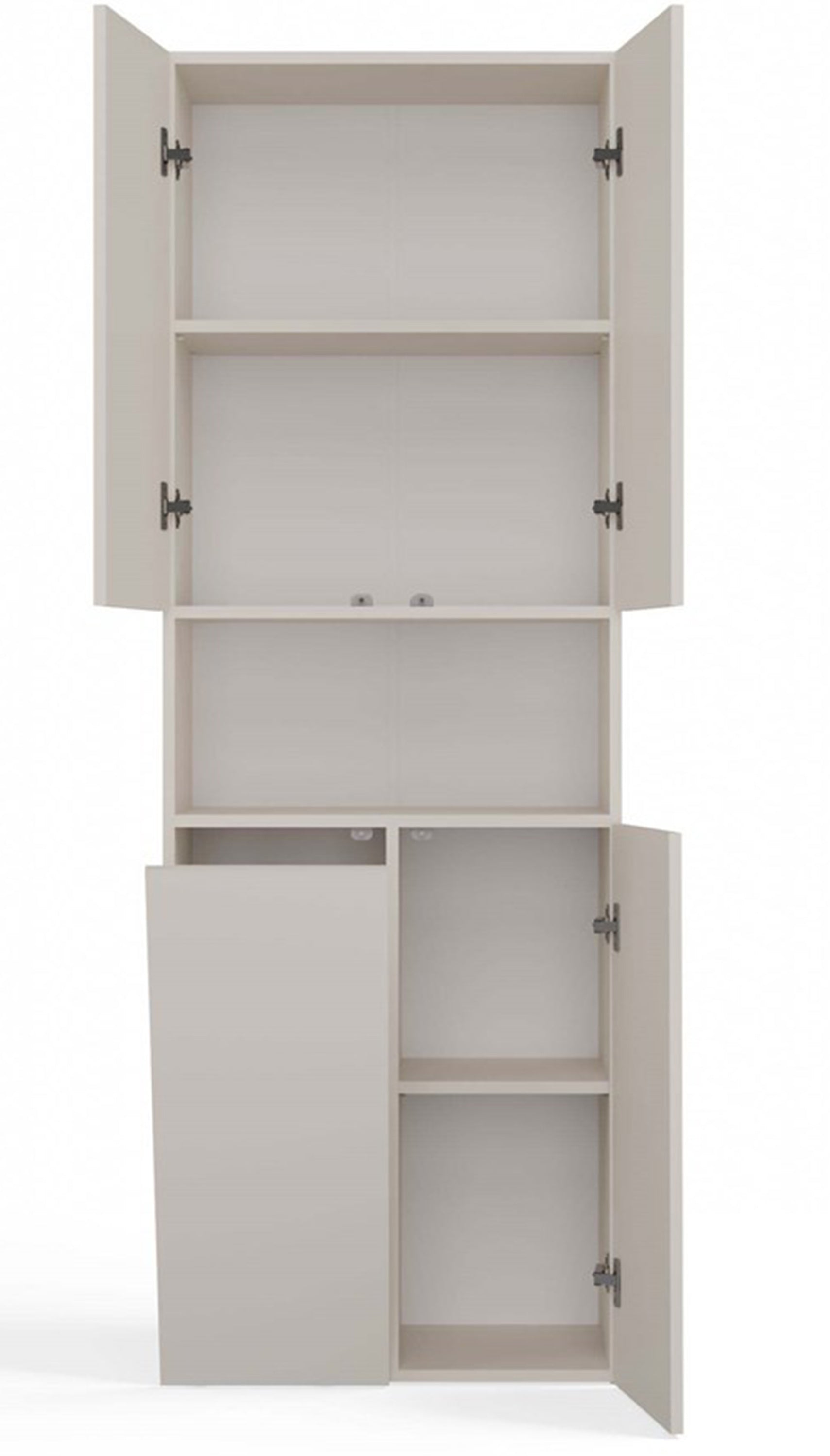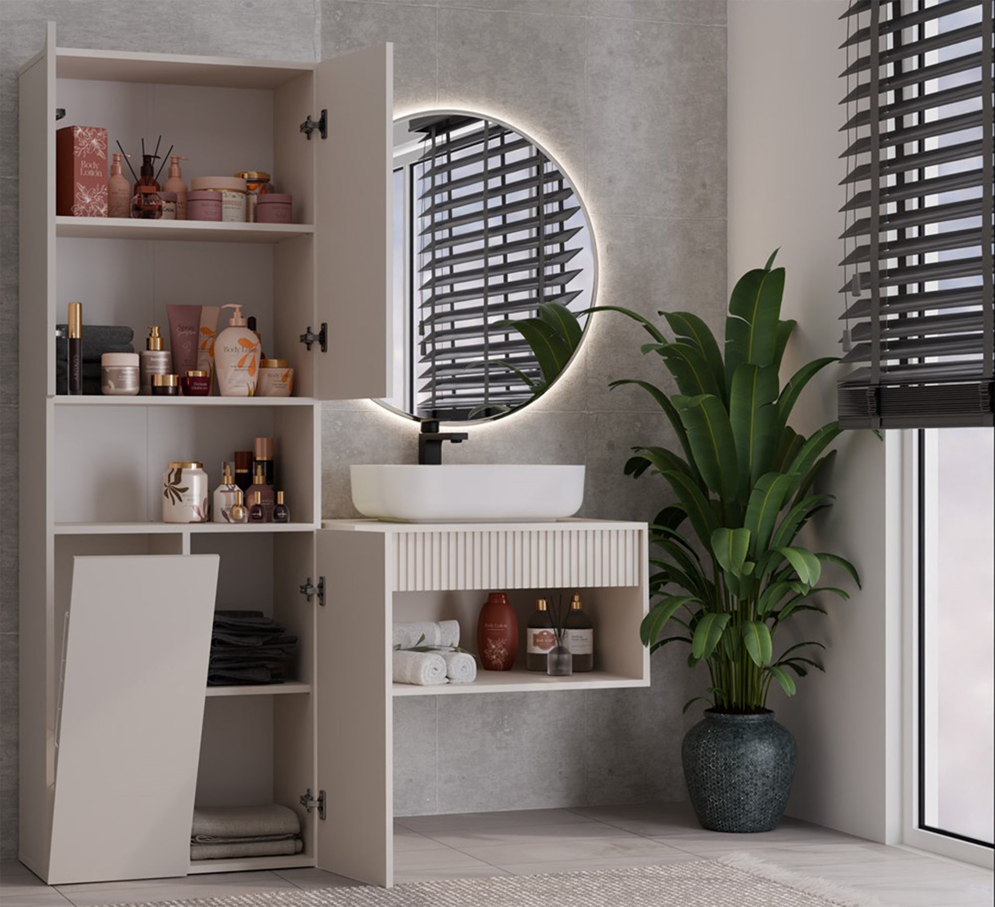 Dostępne w dwóch nowoczesnych kolorach – subtelnym kaszmirze oraz ponadczasowej szarości – doskonale wpisują się w różnorodne aranżacje wnętrz, od klasycznych po minimalistyczne. Szeroki słupek z podwójnymi drzwiami, otwartą wnęką i dolnym segmentem, w którym oprócz praktycznych półek znajduje się kosz na pranie, to doskonałe rozwiązanie dla osób marzących o dużej ilości przestrzeni do przechowywania. Kaszmir to delikatny odcień beżu, który nadaje wnętrzu przytulności i lekkości, tworząc harmonijną atmosferę sprzyjającą relaksowi. Niezależnie od tego, czy szukasz miejsca na kosmetyki, ręczniki czy przestrzeni na ukrycie brudnej bielizny – słupek Nel spełni Twoje oczekiwania. Postaw na estetykę, trwałość i funkcjonalność. Sprawdź pełną ofertę i znajdź model idealny do Twojej łazienki!